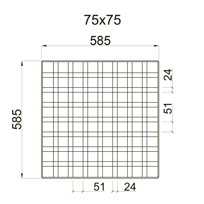Грильято GL-24 75x75, высота 34 мм, ширина 24 мм, металлик — подвесной потолок с решетчатой конструкцией, выполненный из алюминия с металлическим покрытием. Ячейки размером 75x75 мм и профиль высотой 34 мм создают легкость и четкие геометрические линии. Металлическое покрытие придает потолку стильный блеск, улучшая освещенность и создавая современный, элегантный вид.