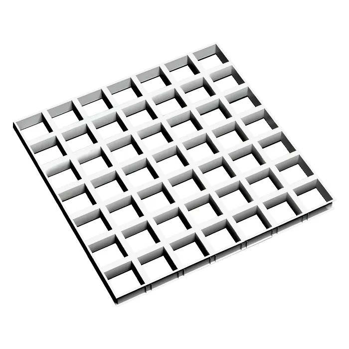 Грильято GL-24 86x86, высота 34 мм, ширина 24 мм, супер-хром — подвесной потолок с решетчатой конструкцией, выполненный из алюминия с супер-хромированным покрытием. Ячейки размером 86x86 мм и профиль высотой 34 мм создают легкость и четкие геометрические линии. Супер-хромированный цвет придает потолку зеркальный блеск, который улучшает освещенность и подчеркивает стиль помещения.