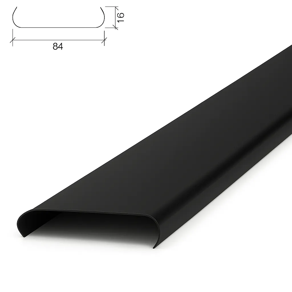 A84A черный — потолочная алюминиевая рейка шириной 84 мм, шаг 100 мм, с открытыми стыками. Чёрный цвет создаёт эффектный контраст и придаёт помещению современный, строгий облик. Применяется в торговых залах, шоурумах, бизнес-пространствах, креативных офисах.