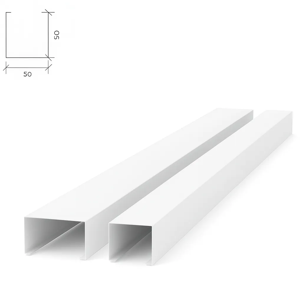 Кубообразная рейка Албес A50/50S PRIM белая оцинковка — усиленный симметричный профиль 50×50 мм, изготовленный из оцинкованной стали 0,4‒0,5 мм и покрытый стойкой белой порошковой краской. Это улучшенная версия системы A95S для эксплуатации в условиях высокой влажности и механической нагрузки.