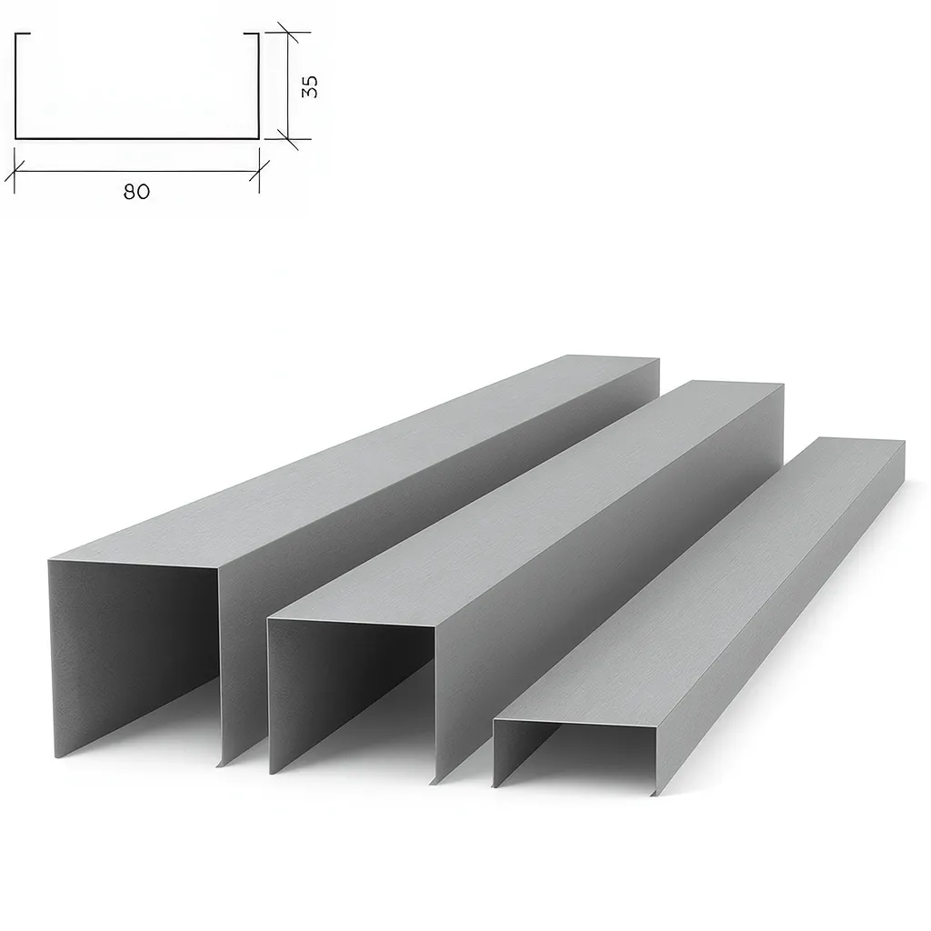 Рейка кубообразная Албес A80/35S металлик матовый — профиль из металла для дизайнерских потолков в рамках системы A100S. Имеет ширину 80 мм и высоту 35 мм, поставляется длиной 3 и 4 метра, возможно изготовление до 6 м.