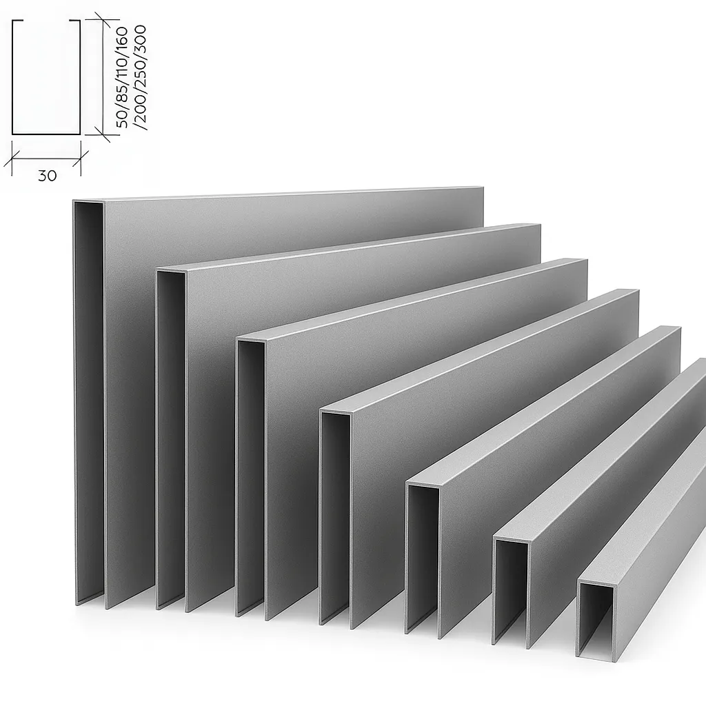Рейка кубообразная Албес A85S металлик матовый — архитектурный профиль системы A50S с геометрией 30×85 мм. Изготавливается из алюминия или оцинкованной стали и покрывается стойкой матовой краской цвета металлик.