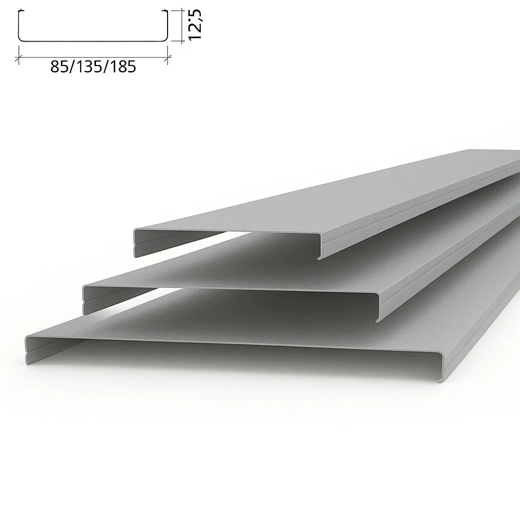 AN135A металлик матовый с перфорацией — широкая потолочная рейка с перфорацией Ø 1,5 мм. Шаг установки — 150 мм, зазор — 15 мм. Цвет «металлик матовый» сочетает современность и строгость, а перфорация обеспечивает акустический комфорт. Идеальна для переговорных, залов и открытых офисов.