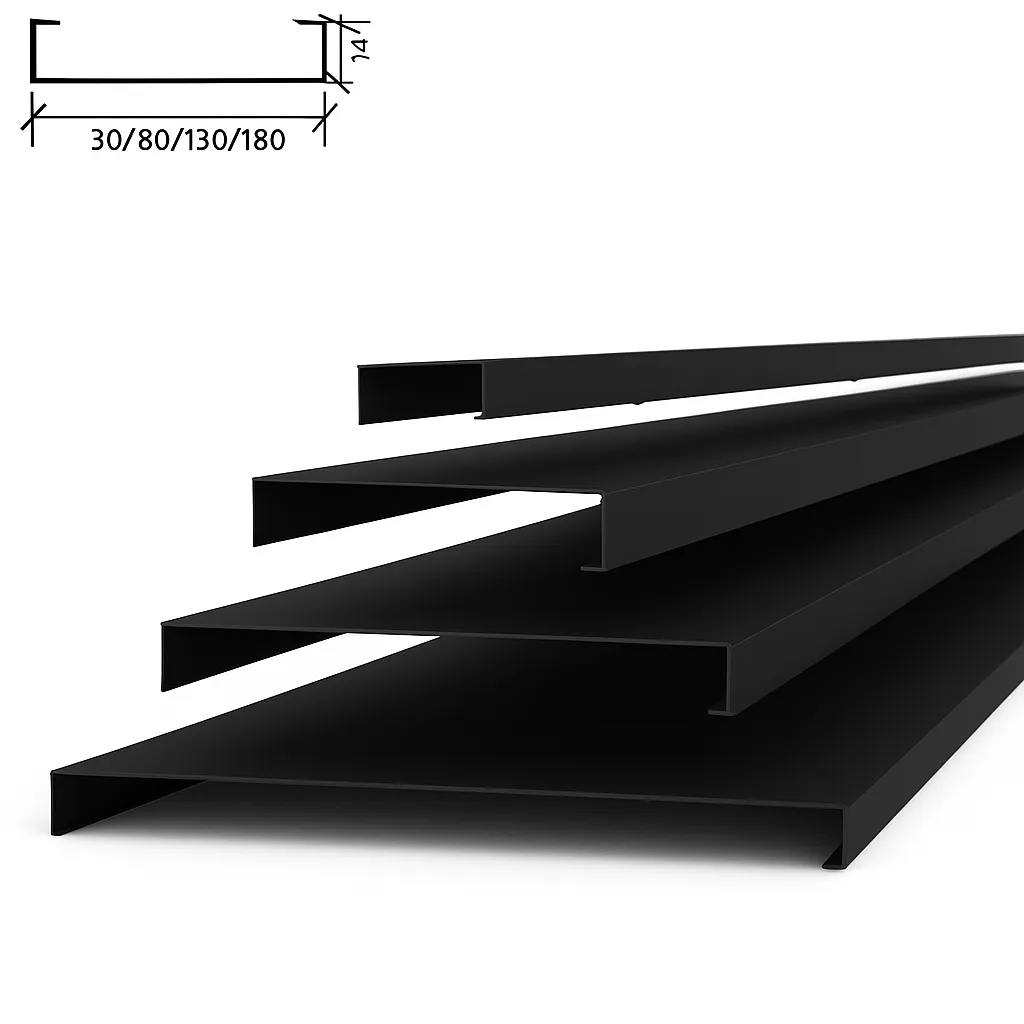 Албес A30SV чёрный — это узкий потолочный профиль шириной 30 мм и высотой 14 мм, выполненный из алюминия и окрашенный в насыщенный чёрный цвет. Подходит для дизайнерских интерьеров, административных и коммерческих помещений. Устанавливается на открытую гребёнку BTS (BT‑4‑50).