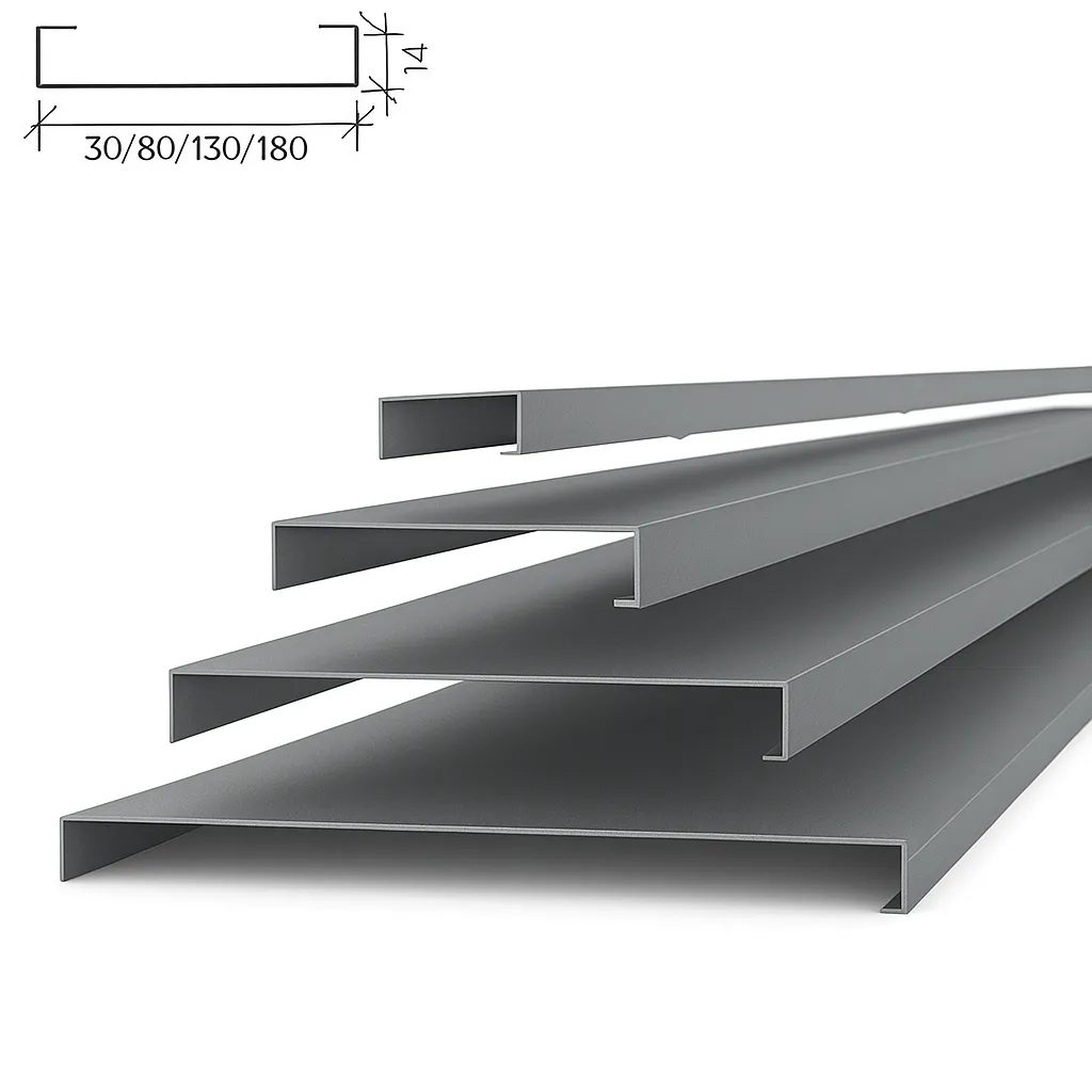 A30SV металлик — это узкий потолочный профиль шириной 30 мм и высотой 14 мм, окрашенный в популярный металлический цвет. Используется в административных и коммерческих помещениях, санузлах и технических зонах. Монтаж — на открытую гребёнку BTS с модульным шагом 50 мм.