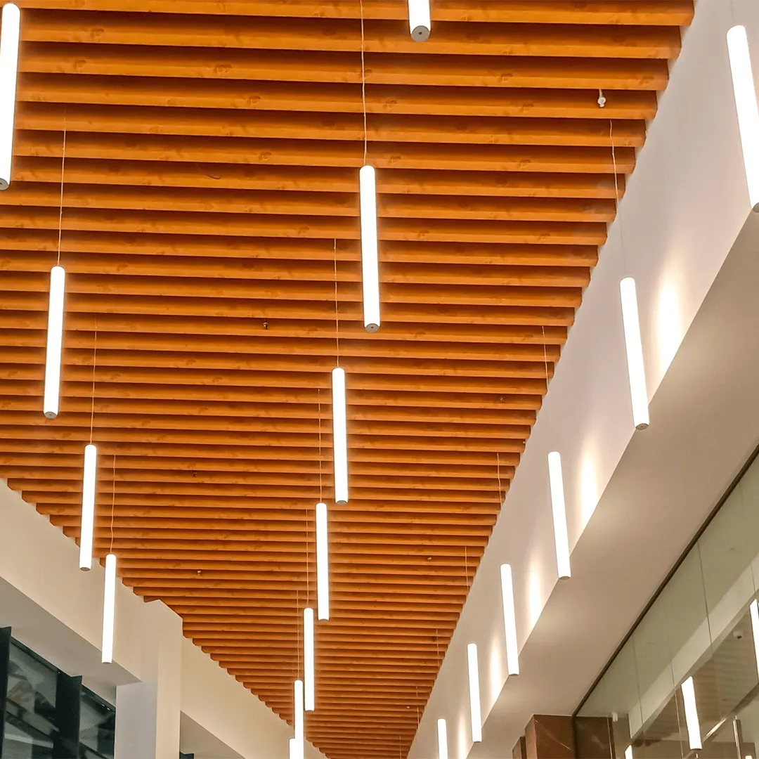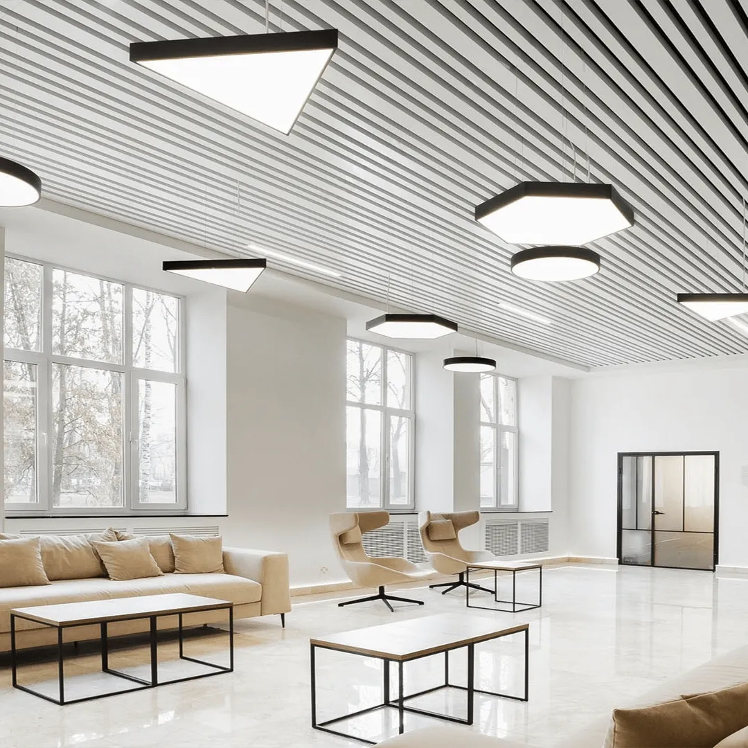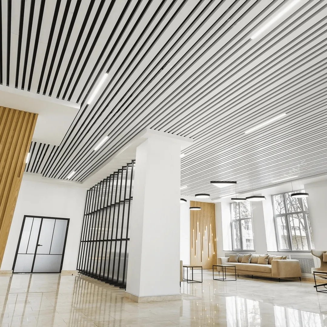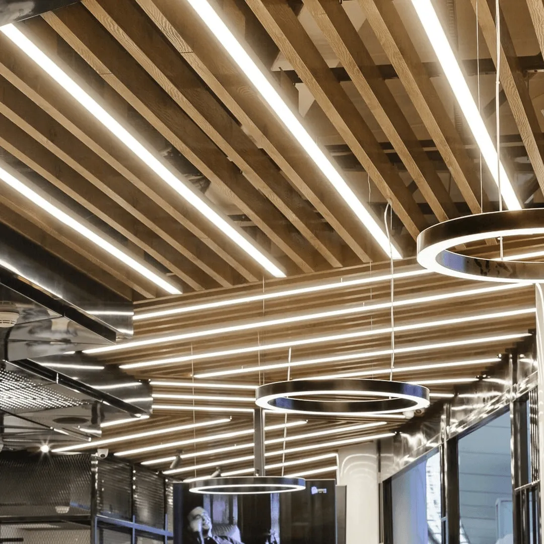 - Реечные потолочные и стеновые системы: металлические ламели, доступные в различных цветах по шкале RAL, а также с текстурами ценных пород дерева. Возможен монтаж в разных плоскостях и с различным шагом, включая установку "волной".